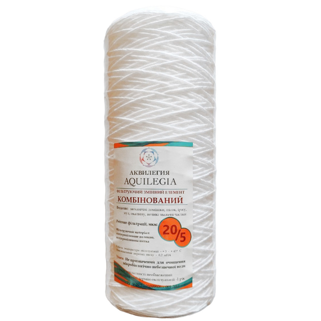 Комбінований фільтруючий елемент Аквілегія використовується для попереднього очищення холодної води. Захищає наступні етапи очищення води, побутову техніку, сантехнічні прилади.